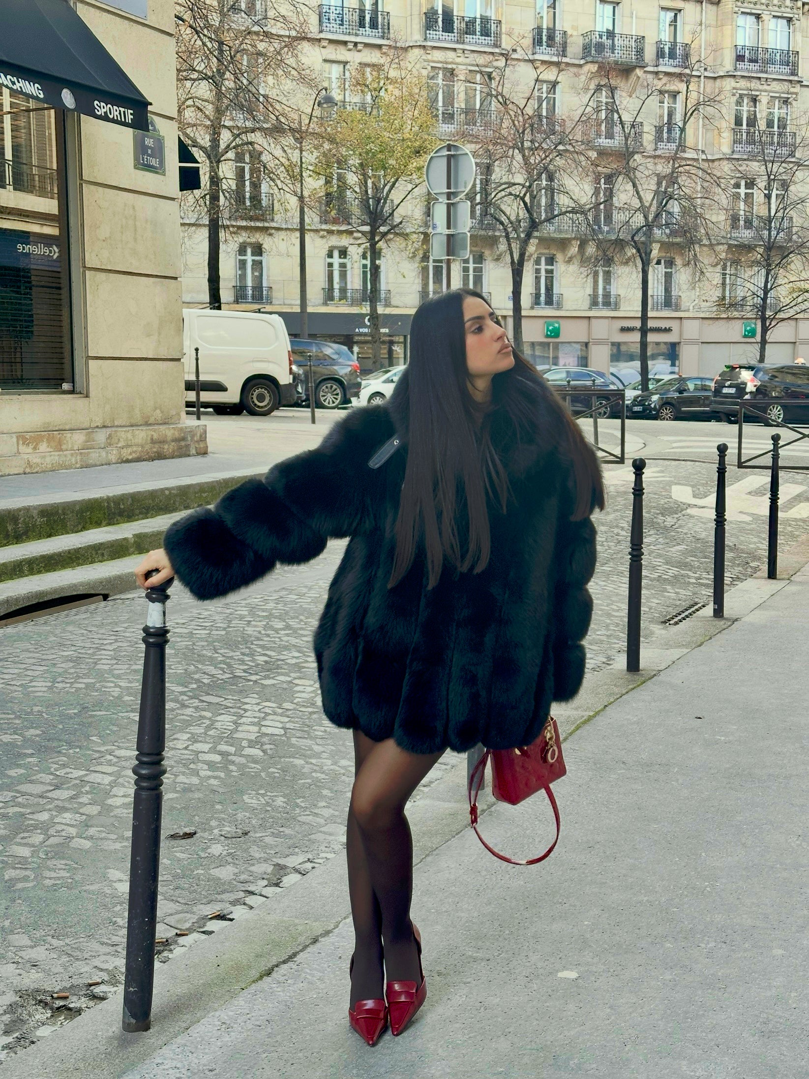 • Nos manteaux de fourrure ont une coupe plus ajustée. Pour plus de confort, nous conseillons de choisir une taille au-dessus de votre taille habituelle, notamment si vous souhaitez porter un pull en dessous.