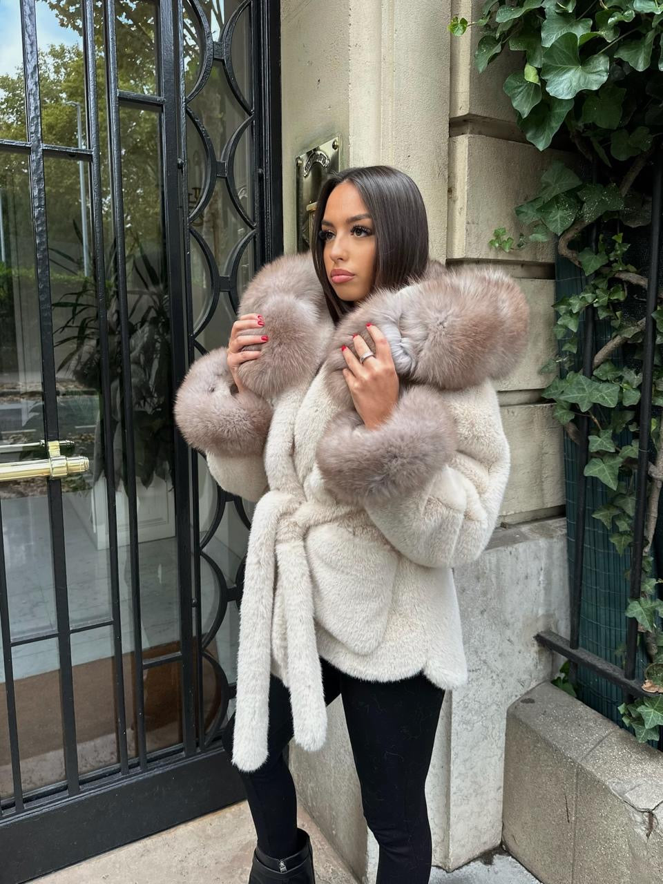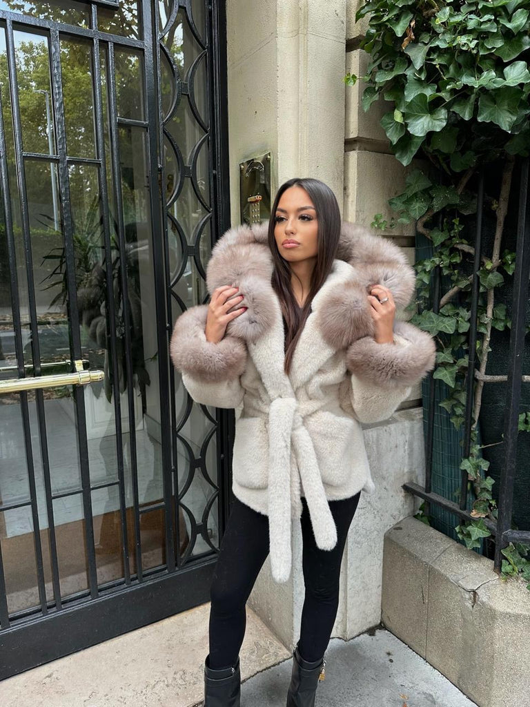 Le corps du manteau et la capuche sont confectionnés en fausse fourrure d'un gris intégral élégant et profond, assurant un volume généreux et enveloppant. Pour une touche d'opulence, le col et les manchettes sont ornés de véritable fourrure de la même teinte beige, offrant une texture et une richesse incomparables aux points clés.
